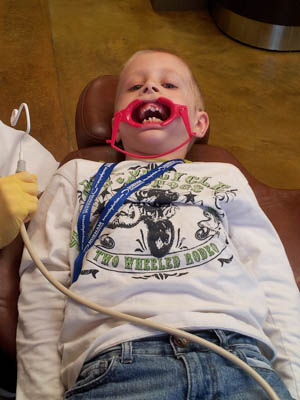 I brought Covey into the Orthodontist on Tuesday to get Braces put on his teeth. It started out pretty good. He got a new t-shirt from them, and learned how to go brush his teeth right away when he gets there. They also gave him a rewards card where he can earn points to redeem for gift cards if he has good hygiene etc. Once he got back to put on the braces he started to get nervous. He looked at me and silently mouthed the words “I’m Scared”. To which, being the good mom I am, I said “What’s that Covey? You’re ready for a shot now?” I think the lady working on him thought I was crazy to say a thing like that, but Covey got a big grin. He got his braces on and picked out red rubber bands to hold the wire in place. The front tooth was so far back that they really had to push the wire into place, and then it came out and rested on the baby tooth next to it. The orthodontist said that it was fine and that it would not hurt his tooth at all to have it rest there. We finished up and left the office.