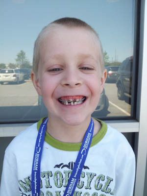 On the way to bring him back to school Covey started to eat a peanut butter sandwich. All of a sudden I heard him yell, and then start crying saying “Mom, it hurts. Something happened. Something slipped. It hurts mom, it hurts.” I thought maybe one of the back brackets hadn’t glued on right and had popped off. I pulled over the car and then climbed out to look at his mouth. The wire that had been leaning on the baby tooth had been pushed down by the sandwich and was wrapping around the bottom corner of his tooth. I turned around and brought him back to the orthodontist. By the time we got there the wire had finished moving and was completely behind the tooth instead of in front of it. The orthodontist added an extra bracket to the baby tooth to help stabilize the wire until his teeth get more in place. I felt bad though because in order to put the extra bracket on, they needed to take the wire off. When the removed the rubber bands Covey burst into tears. He had already worn the braces long enough that the little pressure they put on his teeth hurt.