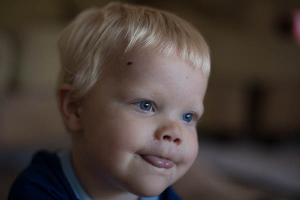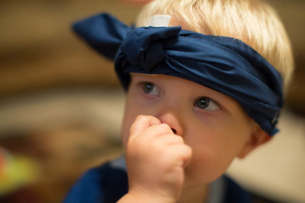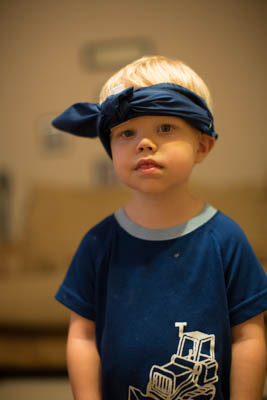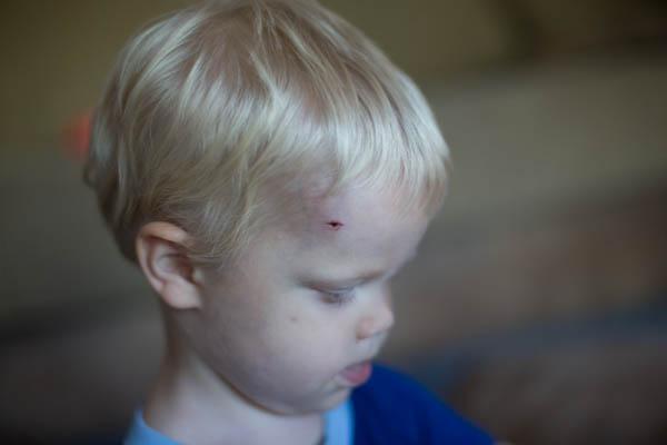 Monday night a couple weeks ago was eventful. We had our monthly combined family home evening over at my sister-in-law’s house. We headed over and went swimming as a family. Covey is super excited because this summer he has finally learned how to float on his back. I counted and he has now been able to float for two minutes straight. We finished swimming, changed into pajamas, and ate some cookies. The kids were a bit upset when we said it was time to go home, however it was after bedtime already so we needed to leave. We got home at 9pm (an hour after bed) and were hurrying to try and get the kids tucked in. Unfortunately as we were kneeling down to say prayer Phoenix, who was dancing around the living room, tripped and fell hitting his head on the bottom of the rocking chair. I looked as he hit and saw the cut on his head open up. I grabbed him and shouted to Brandt that he had a head wound as I rushed into the kitchen before the blood got flowing too bad. I had to hold his hands down as he kept trying to grab the wound that was bleeding all over me and the floor. Brandt ran into my sewing closet to get some cloth that we could tie around his head. Once we got the fabric tied tightly he was still crying hard. I looked up and noticed that Jerrica and Covey were both sobbing in the living room. I wondered for a second if they had been fighting and asked why they were crying. Covey answered, while crying, that he was just so sad for Phoenix. I guess all the blood had them freaked out. We calmed everyone down and cleaned up the mess. Than once the kids were in bed I found the Neosporin and unbandaged his head so we could see if the bleeding had slowed down or if he needed stitches. Luckily it had slowed down a lot. I cleaned and bandaged it, and he slept with the cloth tied around his head.