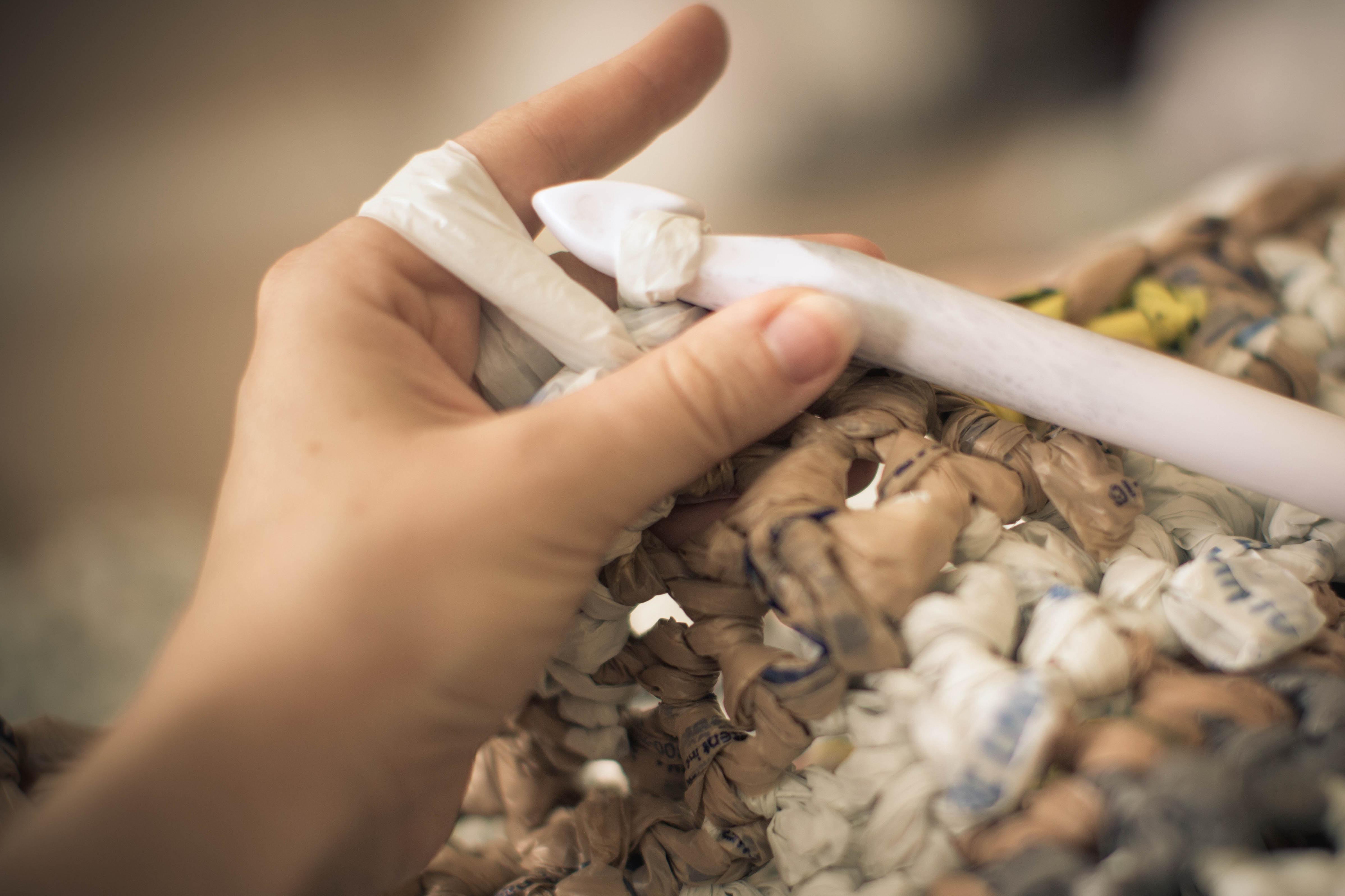 Tuesday night I went to church for our monthly midweek meeting.  While there we got working on a service project crocheting ground mats for the homeless out of plastic grocery bags.  I normally do not like crocheting because I when I have tried making blankets I never finish.  I work for a while and give up.  I am however finding it very relaxing and satisfying doing this right now.  I also love how with the big crochet hook I can see progress very quickly.