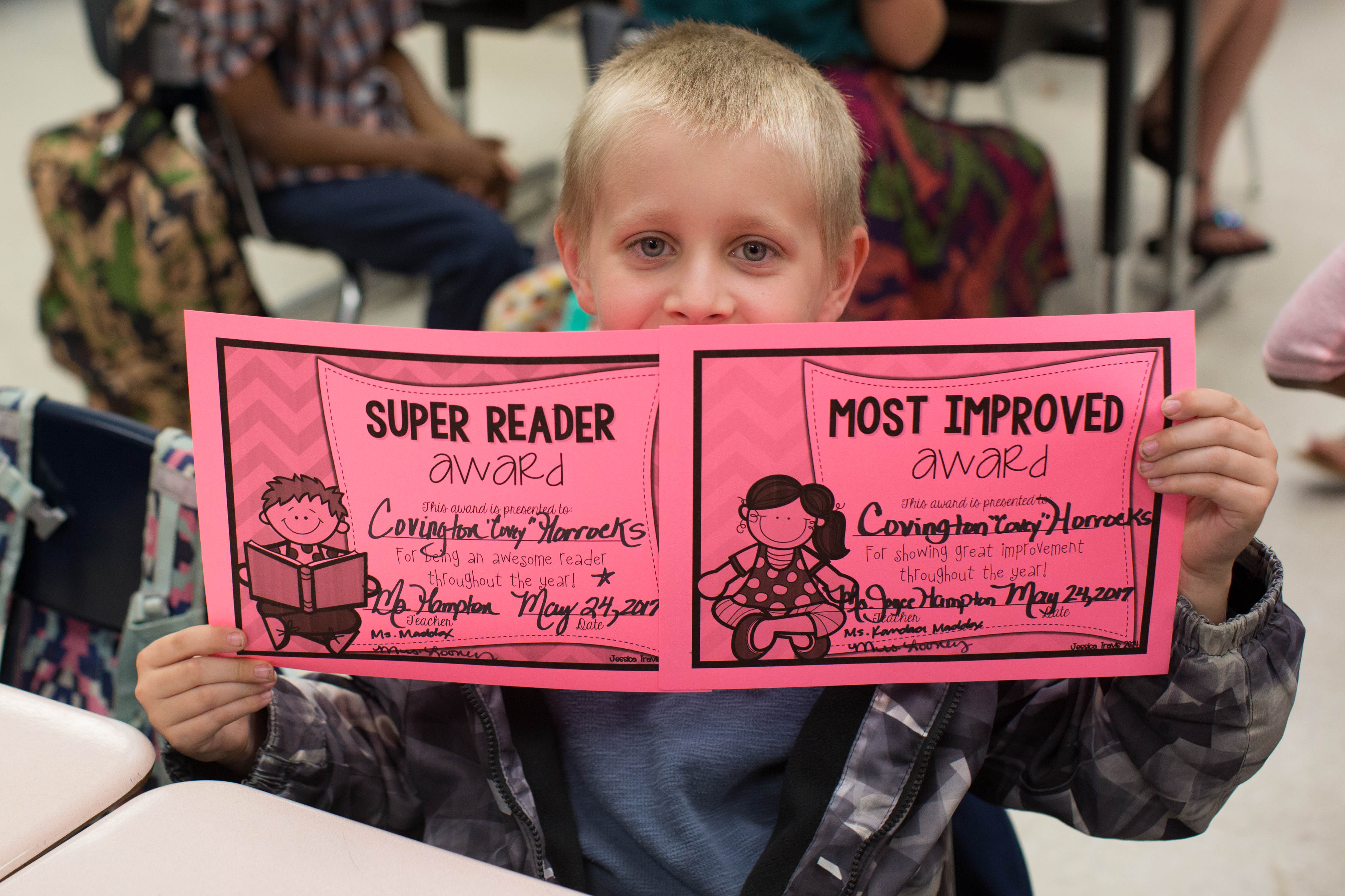 In class he got the “Most improved” and “Super Reader” awards. His classmates voted him the “Best behaved” student.